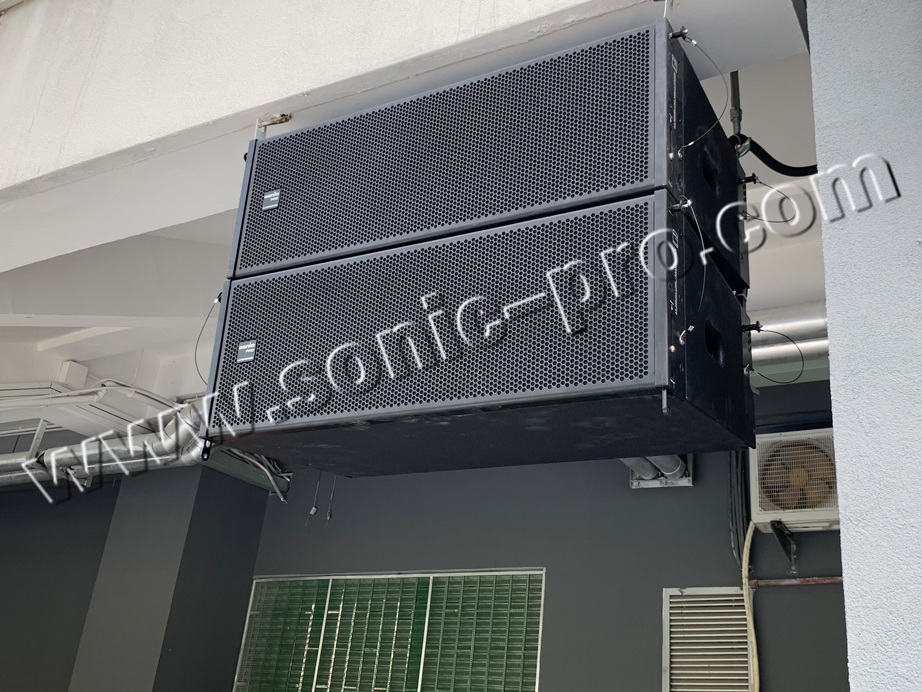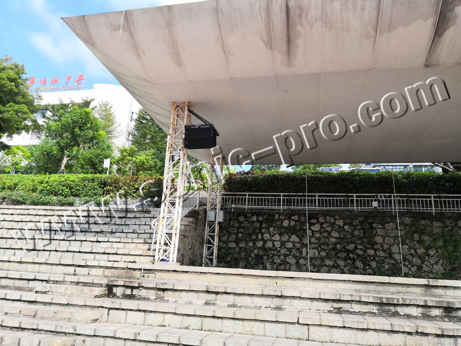 我们在田径场主席台一侧,设计了两组线性音箱,每组是采用两只双十寸线性阵列音箱,线阵音箱是指以线声源的方式扩散,其特点是声压衰减慢、