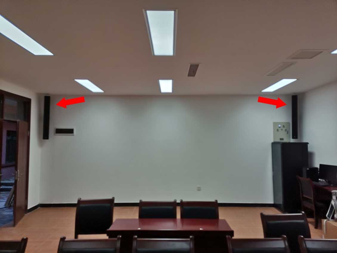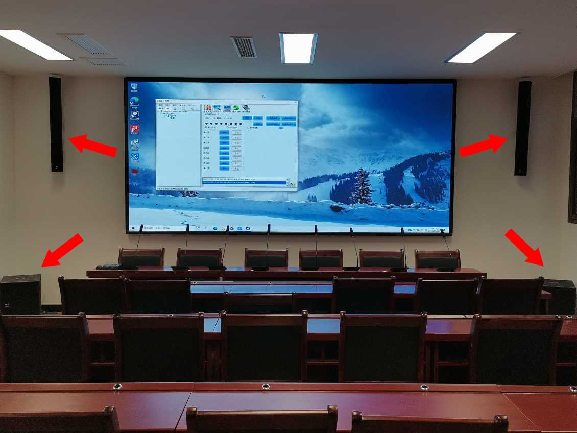 我们选用了四只TH-M481线性音柱和两只LA-12S低音陕西音箱来进行扩声。线性音柱具有小箱体,大功率的特点,人声清晰饱满,还原度高。会议室采用四角壁挂的安装方式,可以保证声压级均匀合理。