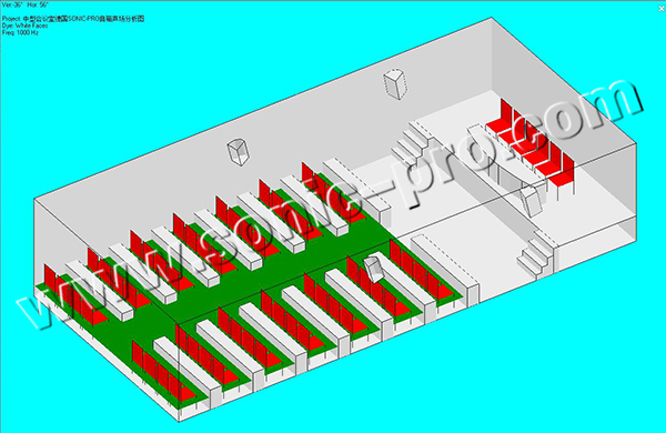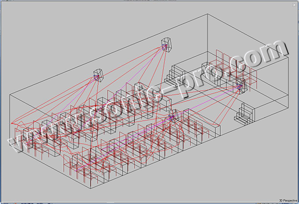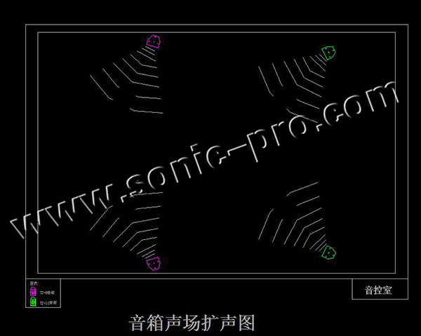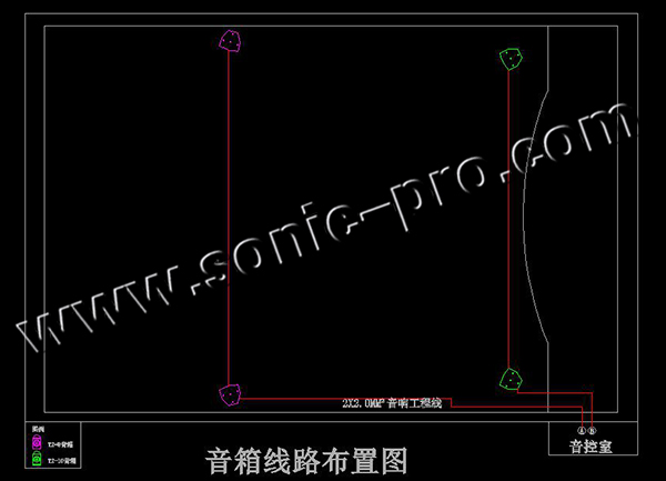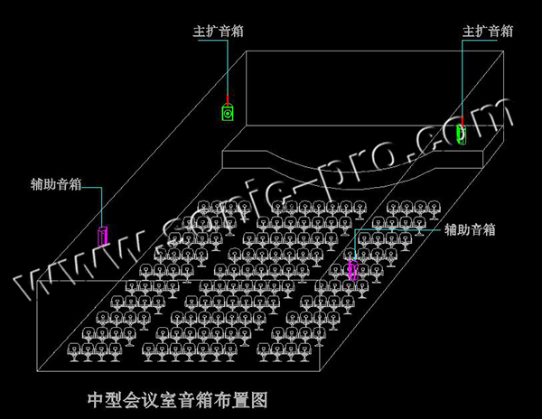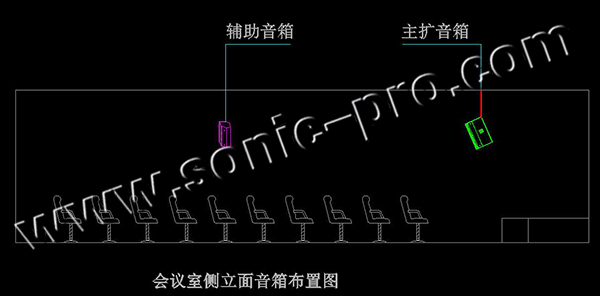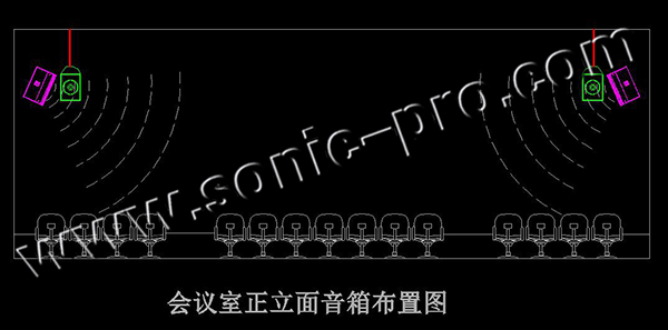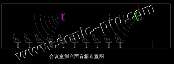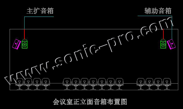 根据图纸得知该会议室有一2米深、10米宽的主席台,观众席面朝主席台固定安装分布,结合图纸情况根据我们多年同类项目的经验,该会议室采用分散式扩声方式作为音箱基本布局,以主扩声音箱与辅助扩声音箱相结合,我们设计在主席台前沿左右吊挂各安装1只SONIC-PRO音响TZ同轴系列十寸全频同轴音箱作为该会议室的主扩声,负责整个会议室的大部分区域扩声,同时该音箱也作为观众席区域听觉和视觉的一致性的声像定位;另外我们在会议室的中场的左右两侧设计安装2只TZ-8八寸全频同轴音箱负责会议室后场声音覆盖,这样主扩声结合辅助扩声采用分散式布局方式能有效保障会议室的声场分布均匀,声音与发言者的方向一致,即使播放视频影音资料也能有效保障视听声像。