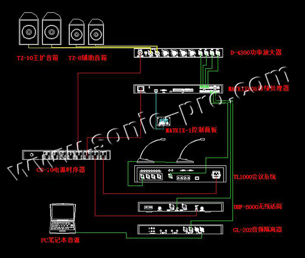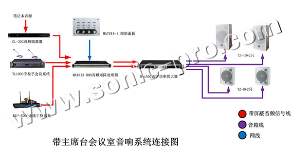 总的来说,会议系统能充分体现先进、科学、环保的基本原则,其高要求的会议效果表现必将带给客户最佳的艺术享受。会议系统扩声环境的搭建主要由声源设备→调控设备→放大设备→重放设备组成。该会议系统中,音频处理MATRIX808直接连接TL1000手拉手系统控制主机通过处理信号分配后连接D-4300功率放大器;功率放大器连接TZ-10主扩及TZ-8辅助专业全频音箱。