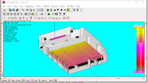 由于EASE软件可以显示厅堂建筑上陕西音箱的类型、安装位置及安装角度;显示扬声器至其声音覆盖区的直达声声线及声场的等声压级图;可显示听声面在多个重要频段电声系统直达声Direct SPL和总声压级Total SPL的计算结果及其声场的分布;显示辅音损失率ALS计算结果;显示语言可懂度C50计算结果;显示语言清晰度STI计算结果等强大功能,所以它能在设计阶段提供在一定建声条件下和一定电声条件下模拟效果的预计。可为扩声系统扬声器施工安装、施工调试提出指导性建议。EASE软件可以计算出声场相关的声学参数,其计算数据与最后的电声实测结果比较,误差可以控制在1dB以内,具有非常好的可信度,得到国际上最广泛的认可。