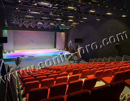 演播厅使用特点是,面积较大,需要实现远距离,大声压的扩声,因此我们配置了左右主扩声陕西音箱,一边采用三加一的线性阵列音箱,高品质的喇叭单元配置,提供高音顺滑,中音通透,低音饱满的扩声。