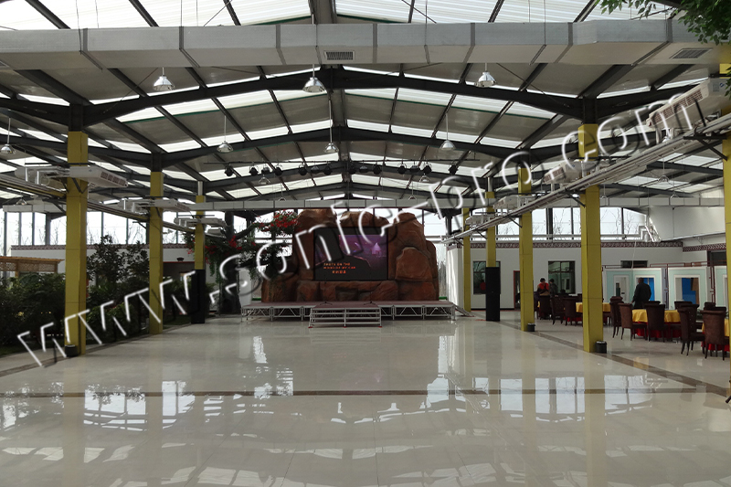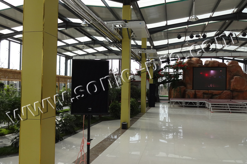 酒店宴会厅使用的音响设备由SONIC PRO音响倾力为其量身打造,此次音响系统的搭建采用了4只双15寸音箱TB215、2只单15寸音箱TB15,TB系列音箱忠实还原语音以及音乐扩声,其具有丰富的吊挂点位,且在音箱底部设计一个35mm的支架孔座,箱体由15mm高密度板构成,表面?为耐磨的黑色点纹防水环保水性油漆,后接线板两个并联的NL4MP芯插座方便连接,黑色内覆透声声学海绵结合穿孔铁网保护音箱单元,面网固定采用内六角平面螺丝整体美观大方。配上SONIC PRO音响最新开发的定位于娱乐工程、户内外演出全方位应用的陕西功率放大器TD-600、TD-800,大功率,多功能,高质量,音色优美及稳定性于一身的专业功率放大器配合12路陕西调音台MX12C、为整个音响系统提供了高品质的音频控制以及良好的保证。再配备SONIC PRO音响专门为搭配SONIC PRO音箱而专门开发的陕西音频处理器MATRIX306等周边设备,UHF-5000演出级的话筒,为造访该酒店的客人提供了一场听觉盛宴!