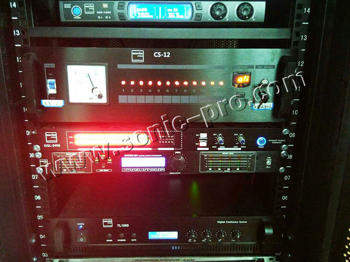 搭配2台具有高效转换率的4通道数字功放(D-4300),保证扩声能有足够能力,配合12路数字陕西调音台(GL-24)、数字陕西音频处理器(MATRIX 204)及智能反馈抑制器(DGL-2408)使得音色更加细腻出众,