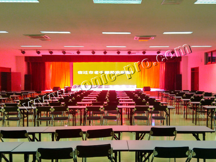 此次宿迁市老年大学多功能厅扩声系统全部采用SONIC PRO(斯尼克)音响产品。其中主扩部分采用2只十八寸同轴全频音箱(TZ-18);