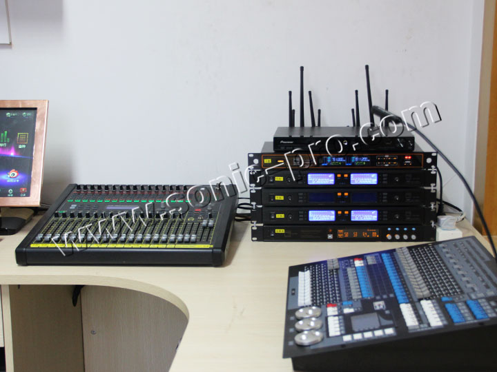 音源部分采用一拖二无线手持和头戴话筒(UHF-5000),UHF-5000具有完美的拾音能力,可以保证主持人和演唱者声音的拾取;采用真分级接收系统,接收距离更远,不易掉频。