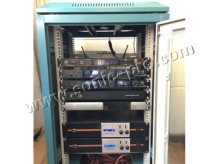 音源部分采用1套UHF-5000一拖二无线手持话筒和2套最新升级的WS-860一拖四无线鹅颈话筒。