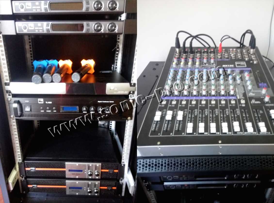 调音部分采用陕西调音台(MX12C);音频处理部分采用了德国SONIC-PRO音响品牌具有智能化操作、功能强大的4进4出数字音频矩阵处理器(MATRIX404);