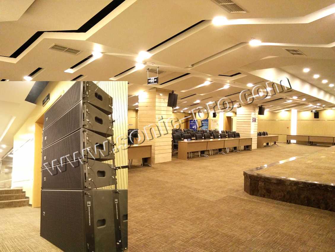 其中报告厅主要用于会议、报告、新闻发布等功能,为了满足以上活动顺利而高质量的进行,更考虑到使用方更方便、更科学的管理、操作设备。项目左右主扩陕西音箱采用8只双8寸线性阵列音箱(LA-208)