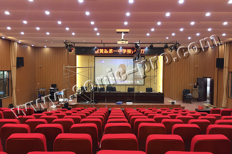 该校报告厅,主要用于大型会议、学术报告、演讲以及娱乐表演,音响扩声系统设计重点考虑语言清晰度,低失真、声压均匀、高声压以及足够的传声增益。