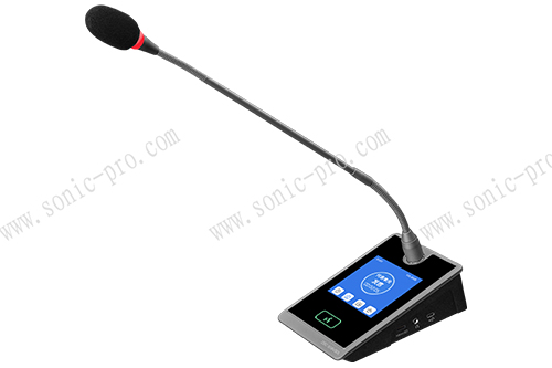 显示屏:话筒自带4.1吋全彩高清触摸屏,显示内容清晰,可以显示当前话筒发言或待机状态、当前时间、单元类型(代表单元、主席单元、VIP单元)、ID、发言计时、音量、日期时间等,可通过触摸屏控制话筒开关(与触摸按键同步)、调整屏幕亮度、语言选择(繁体中文、简体中文、英文)、VIP选择、待机时钟(可显示当前日期时间)、关于话筒信息查看、待机图片选择(可根据用户需要定制如:国徽、党徽、校徽、单位LOGO风景图画等)、服务呼叫选择(技术人员、抽纸、秘书、水、笔、茶、纸、咖啡,可定制其他用户需求功能)、清晰了解当前的使用情况;