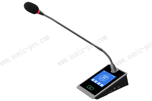 显示屏:话筒自带4.1吋全彩高清触摸屏,显示内容清晰,可以显示当前话筒发言或待机状态、当前时间、单元类型(代表单元、主席单元、VIP单元)、ID、发言计时、音量、日期时间等,可通过触摸屏控制话筒开关(与触摸按键同步)、调整屏幕亮度、语言选择(繁体中文、简体中文、英文)、VIP选择、待机时钟(可显示当前日期时间)、关于话筒信息查看、待机图片选择(可根据用户需要定制如:国徽、党徽、校徽、单位LOGO风景图画等)、服务呼叫选择(技术人员、抽纸、秘书、水、笔、茶、纸、咖啡,可定制其他用户需求功能)、清晰了解当前的使用情况;